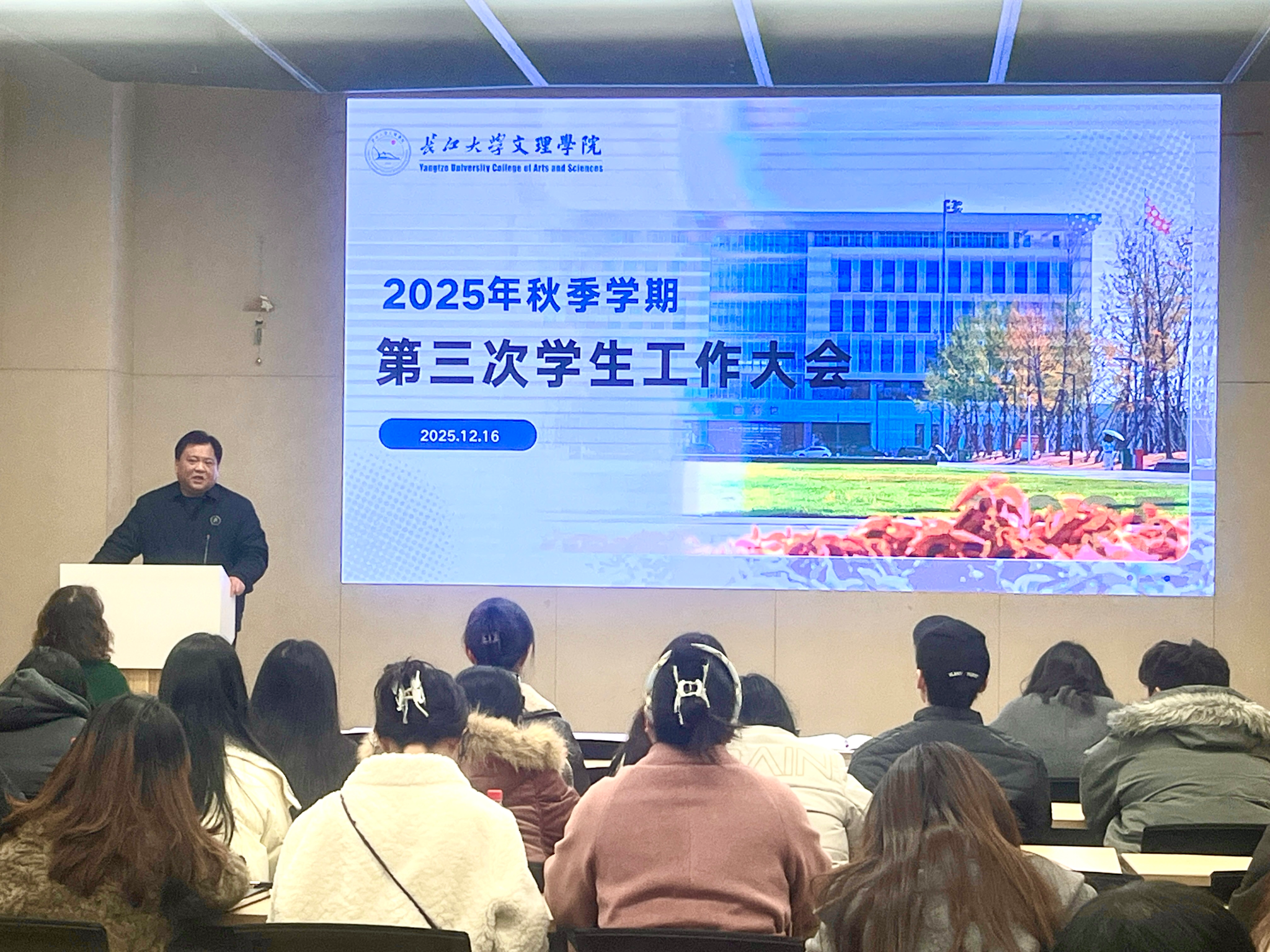 12月16日下午,我校在图书馆103报告厅召开学生工作大会。校领导学院党委副书记李则俊出席会议,各教学单位党总支书记、副书记、辅导员,学生工作处、团委全体成员参加会议。会议由学生工作处处长李刚英主持。