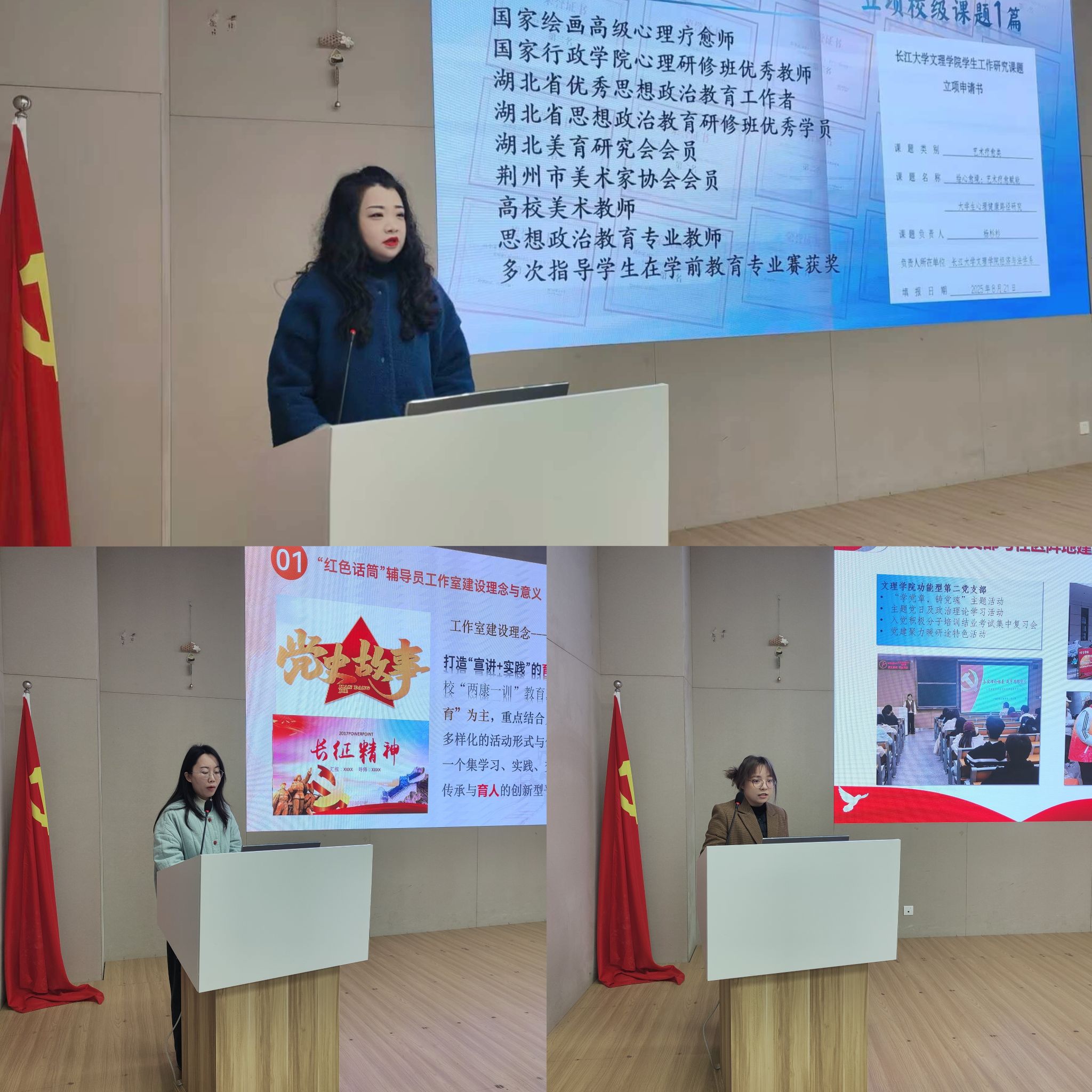 答辩过程中,7个申报团队依次登台,围绕工作室建设方向的可行性、前期工作基础、目标思路、计划举措及创新点等核心内容,通过PPT演示、现场讲解等方式,全面阐述了工作室的建设构想与发展规划。各团队立足“两康一训”核心要求,结合学生成长需求与思政教育工作重点,提出了涵盖心理育人、党建赋能、干部培养、文化浸润等多个特色方向的建设方案,展现出扎实的前期筹备基础与清晰的育人定位。
