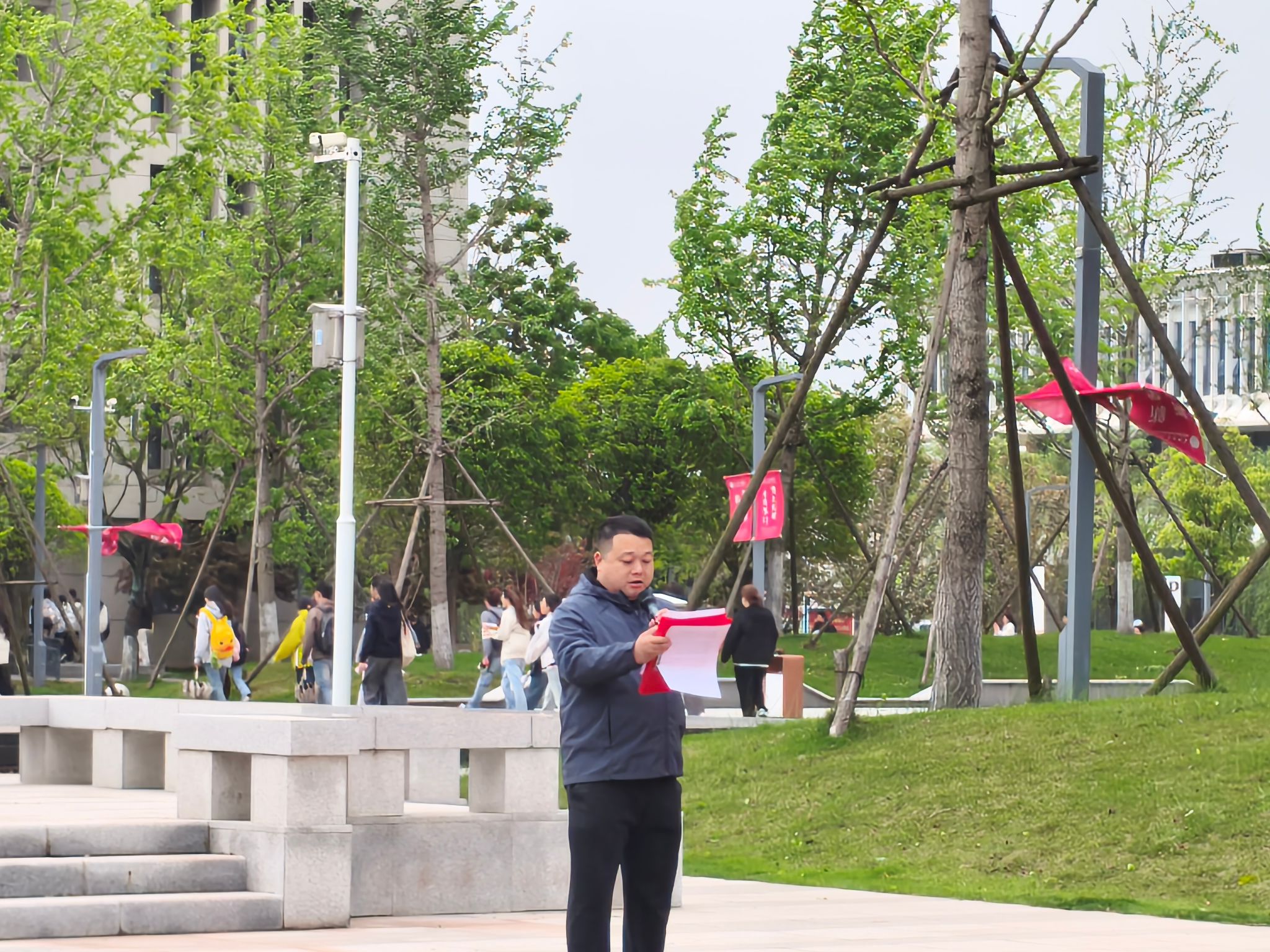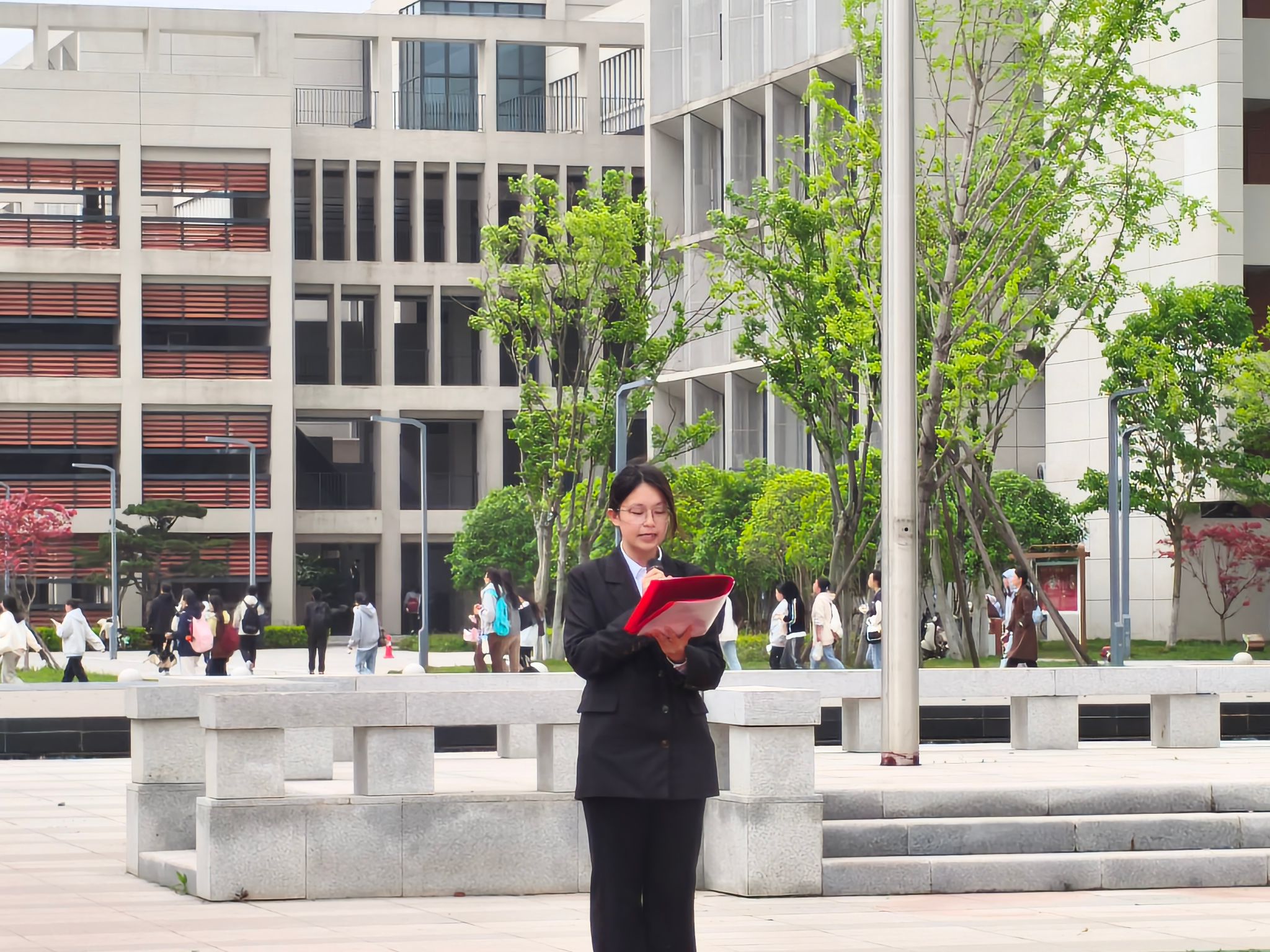 升旗仪式上,学生代表吴诗琪发言。她回顾了我国一代代科技工作者攻坚克难、勇攀高峰的奋斗历程与辉煌成就,号召广大学子胸怀家国、勤学善思、刻苦钻研,以青春之我、奋斗之我书写时代新篇章。