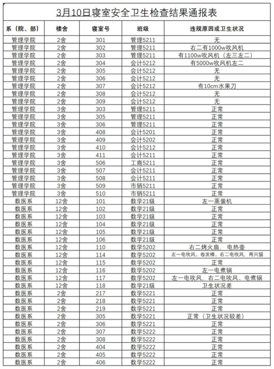 2022-2023学年第二学期第四周寝室安全卫生检查抽查结果通报