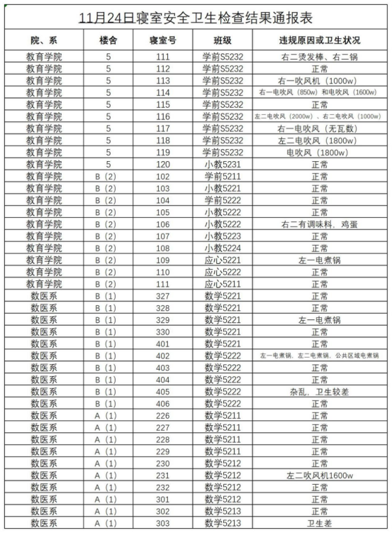 2023-2024学年第一学期第十三周寝室安全卫生检查结果通报