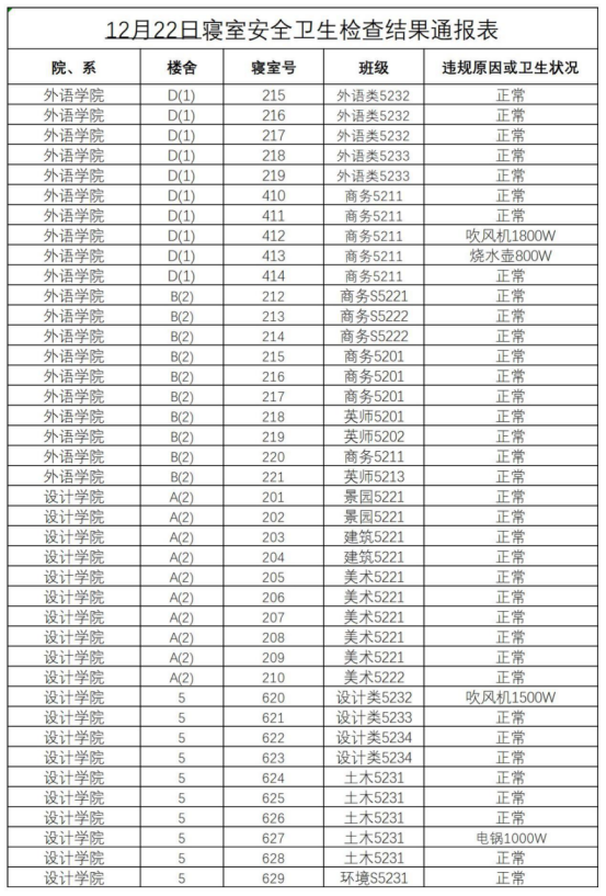 2023-2024学年第一学期第十七周寝室安全卫生检查结果通报