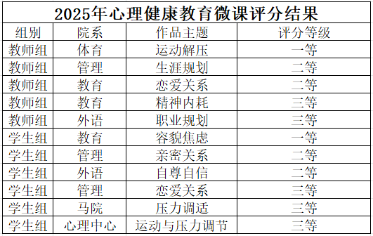 为贯彻落实《关于开展第二届全国高等学校心理健康教育微课征集展示活动的通知》精神,积极宣传和普及心理健康知识,提升我校心理育人工作实效,面向全校开展心理健康教育微课征集展示活动。各教学单位积极组织报名参与,提交作品48项。经过层层筛选和评比,现将结果公示如下: