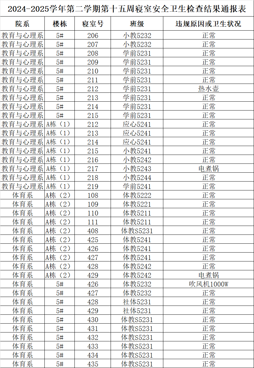 2024-2025学年第二学期第十五周寝室安全卫生检查结果通报表