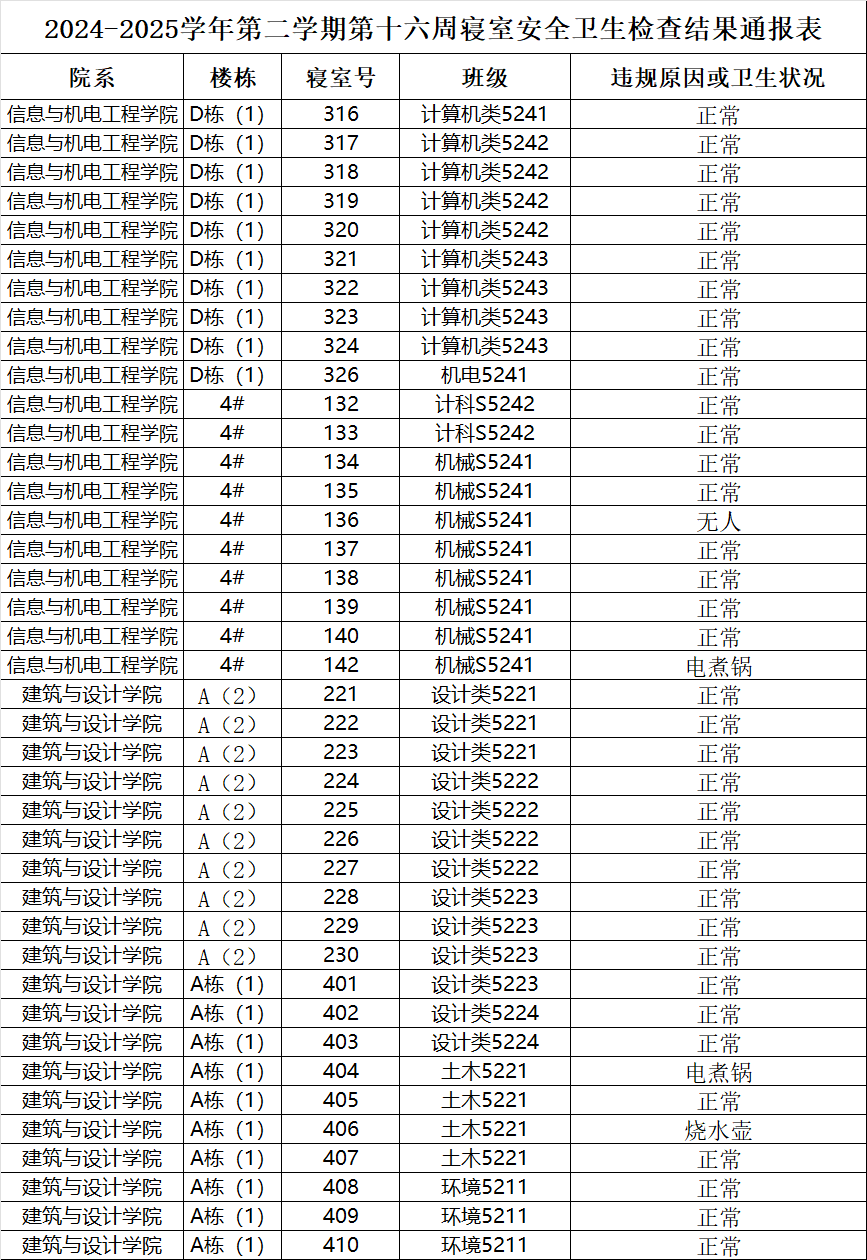 2024-2025学年第二学期第十六周寝室安全卫生检查结果通报表