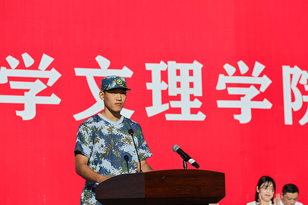 体育系体育教育专业荣家豪同学代表全体新生发言,承诺将不负韶华,笃定前行,在新的人生航程扬帆奋进,乘风破浪,激扬青春,练就本领,书写宝贵青春的精彩篇章。