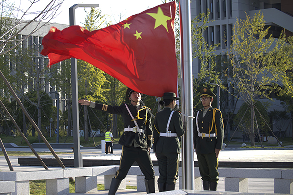 上午7时30分,在庄严的国歌声中,开学典礼拉开序幕。全体起立,奏唱国歌。