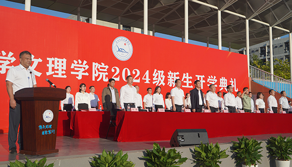 党委书记颜建洲主持开学典礼。颜建洲书记在主持时对2024级新生的到来表示衷心祝贺,寄语新生珍惜大学时光,坚定理想信念,克服困难挫折,勇往直前追逐梦想,直至抵达成功的彼岸。“新时代属于你们,未来属于你们。”颜建洲激励新同学肩负时代使命,勤奋学习,勇于创新,突破陈规,探索未知领域;心怀家国,将个人理想融入国家和民族的伟大事业中,争做新时代“国之栋梁”,成长为堪当强国建设、民族复兴重任的可靠接班人。