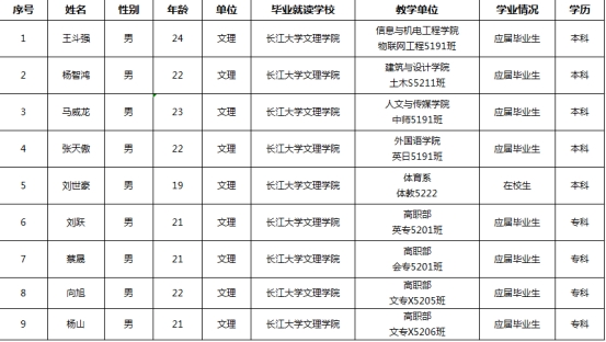 通过荆州区武装部组织的体检、政审考核、心理测试、役前训练等环节,我院王斗强等9名同学经湖北省荆州市荆州区人民政府征兵办公室批准光荣入伍,现根据相关规定予以公示,公示时间为2023年9月12日至9月19日。如有异议,请在公示期内向学院纪检监察部或荆州区武装部进行反映。