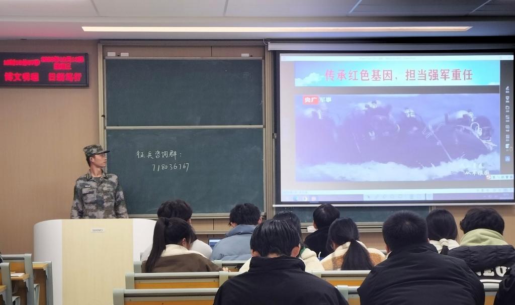 为鼓励大学生积极参军入伍,我院于12月11日开始启动2024年湖北春季征兵宣传进班级活动。活动由党委学生工作部征兵工作站负责统一规划,老兵团中优秀退役大学生组成的宣讲团负责具体宣讲事宜。