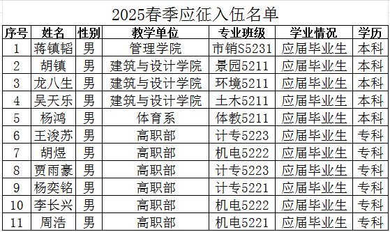 通过荆州区武装部组织的体检、政审考核、役前适应性测试、役前训练等环节,我院蒋镇韬等11名同学经湖北省荆州市荆州区人民政府征兵办公室批准光荣入伍,现根据相关规定予以公示,公示时间为2025年3月10日至3月15日。如有异议,请在公示期内向学院纪检监察部或荆州区武装部进行反映。