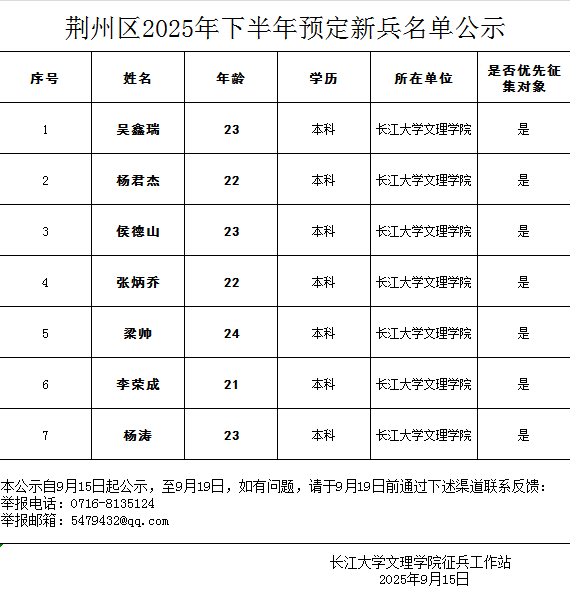 通过荆州区武装部组织的体检、政审考核、役前适应性测试、役前训练等环节,我校吴鑫瑞等7名同学经湖北省荆州市荆州区人民政府征兵办公室批准光荣入伍,现根据相关规定予以公示,公示时间为2025年9月15日至9月19日。如有异议,请在公示期内向学院纪检监察部或荆州区武装部进行反映。