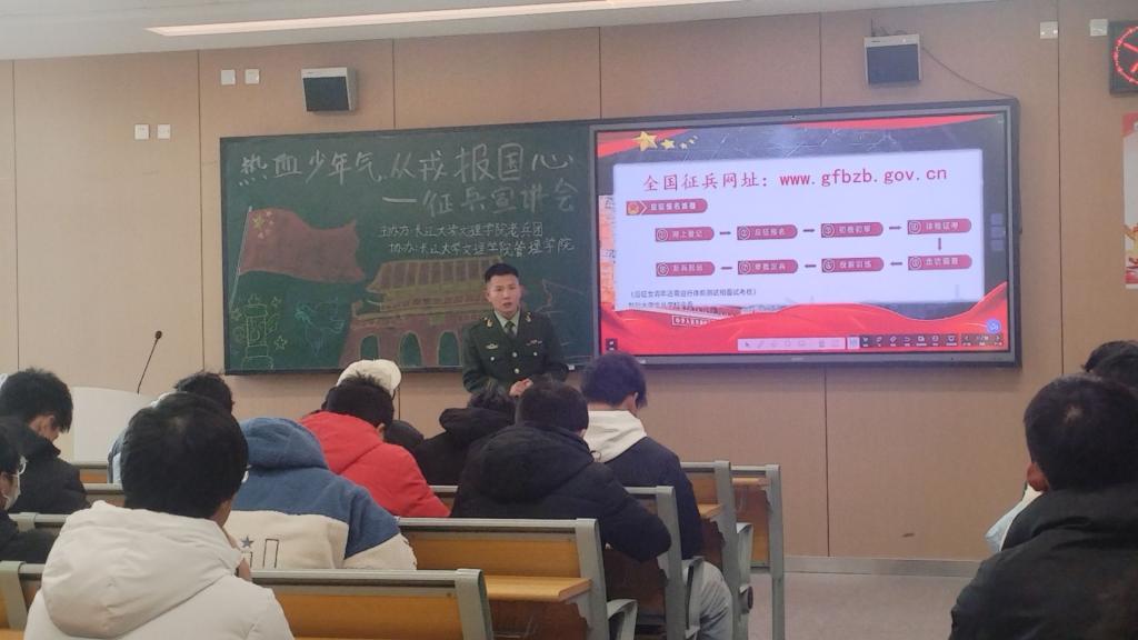 为进一步激发大学生的爱国热情,鼓励青年学子投身国防建设,近日,我校征兵工作站组织的“征兵政策宣讲进班级”活动在各学院陆续开展。宣讲团成员深入班级课堂,与同学们面对面交流,将最新的征兵政策、军营生活、发展机遇等内容精准送达每一位有参军意向的青年学子。