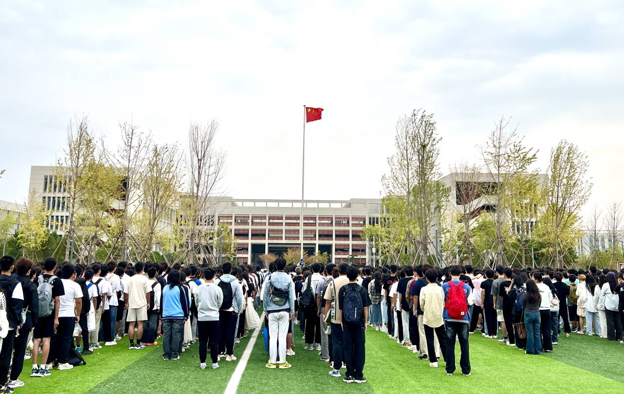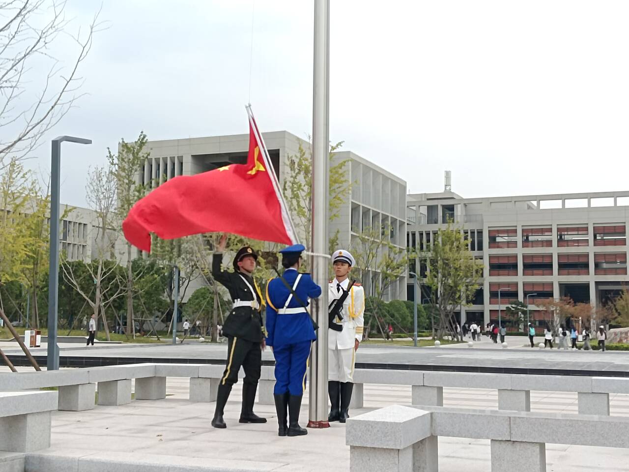 清晨,全院师生列队齐整,七点整,国旗护卫队英姿飒爽,迈齐步护卫国旗走向升旗台。在庄严国歌声中,国旗飘扬升起,我院全体师生肃立致敬,齐唱国歌,表对祖国的热爱与敬意。
