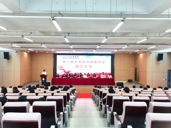 大会在庄严的国歌声中拉开序幕。会议第一项议程,由成观雄介绍大学生自律委员会的成立背景,是学校贯彻落实党的教育方针、深化学生素质教育、建设发展一站式学生社区的重要举措。大学生自律委员会的组织机构,开设五个部门,主要职责是通过开展各项适合广大学生的积极向上的活动,积极创造良好的学风、校风,引导同学们不断提高思想觉悟,做好自身纪律管理工作。发挥学生在管理工作中的自我教育和自我管理作用,充分反映学生对学校的重大教育、教学活动决策的意见和建议。营造良好的学风校风,让全体学生自律自立自强。