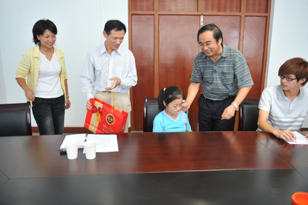 在基础学部办公室,来自会计5091班的曾婷婷被一片温情包围着。由于先天性佝偻病,身材矮小的她生活无法自理,每天由母亲骑三个小时的自行车送其上下学,开学后,该班班委成立了“爱心小组”,由团支书郇雅琪和陈尽轩同学负责背着曾婷婷进教室学习。据该班主任邱凤霞老师介绍,曾婷婷学习优秀,也是班上最勤奋的学生,她这种顽强拼搏精神也激励着身边的每一位同学。