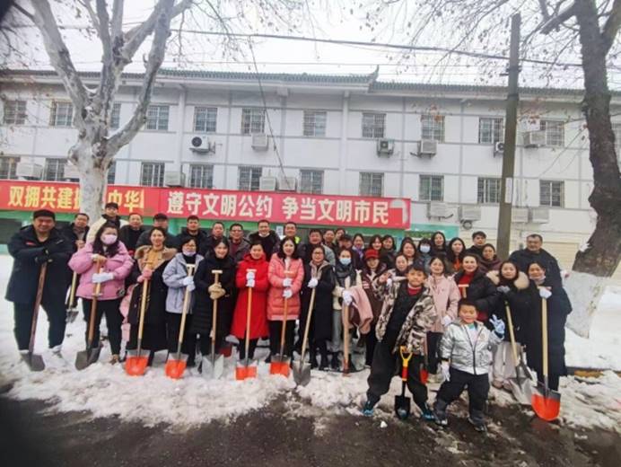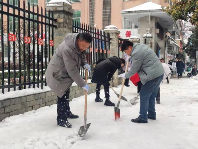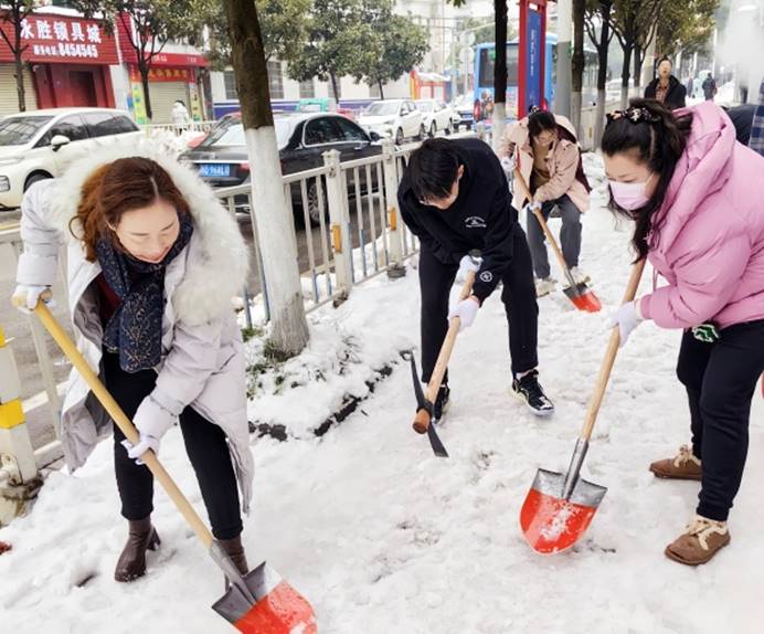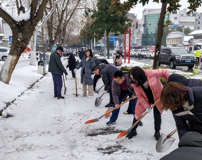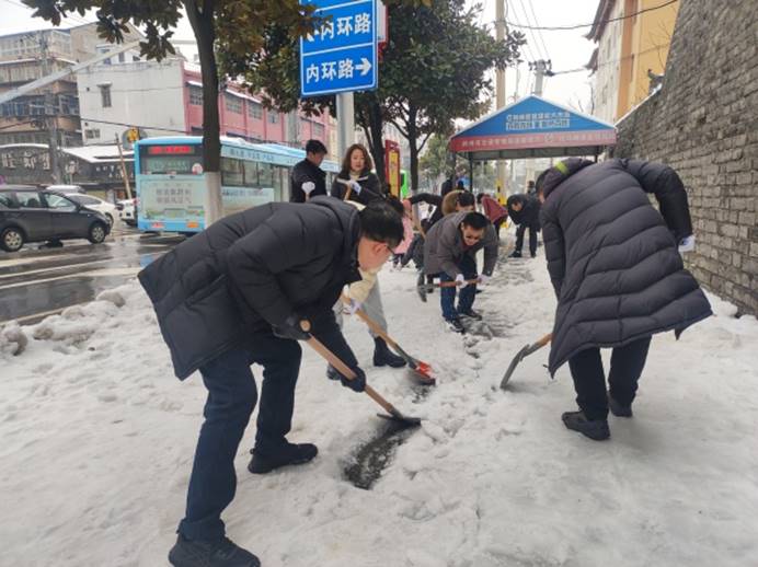 近日,市区出现持续低温雨雪天气,道路积雪成冰。为尽快消除大雪给居民出行造成的不利影响,2月7日上午,学院组织党员干部参加义务清理城区路面积雪活动。学院领导颜建洲、李则俊、曹骥、郭明虎带领党员干部清晨到达郢都路27号路段,大家齐心协力,配合默契,挥动铁锹和石镐,经过一个上午紧张而有序的奋战,终于将包保路段所有积雪清理干净,为居民的安全出行提供了有力保障。