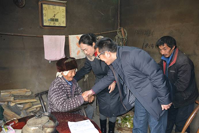 会后,调研组一行到困难群众家中走访慰问。在一位生活困难群众家中,党委书记颜建洲握着帮扶对象的手,细心询问其生产生活各方面的情况,向老人介绍各项扶贫政策,鼓励困难群众坚定信心,克服困难,积极利用政策帮扶增加家庭收入,不断改善生活条件。