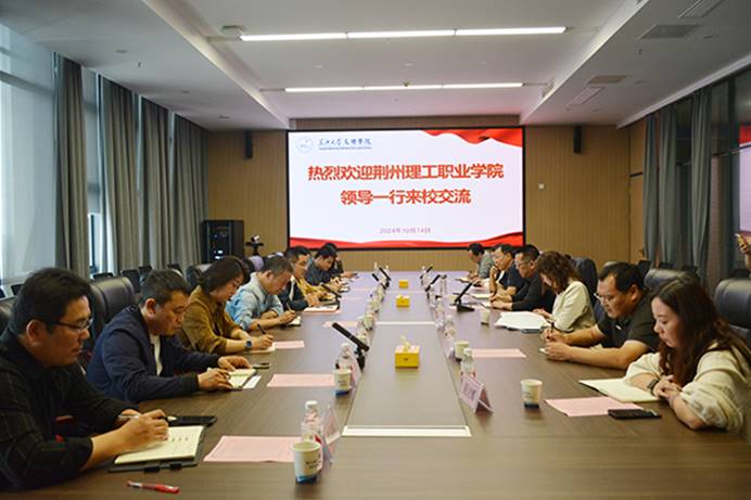 本网讯 10月14日下午,荆州理工职业学院党委书记陈庆华、副校长高元华一行来我校交流访问,校领导学院党委书记颜建洲、院长助理郭明虎和相关职能部门负责人参会