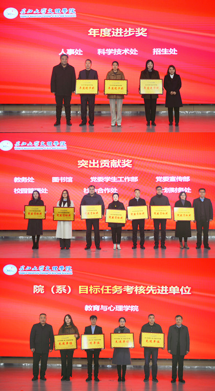 校领导向宇副院长宣读表彰文件。会议表彰了2024年度工作先进集体,校领导依次上台为先进集体代表颁奖。