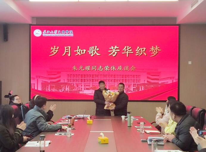岁月谱就芳华,光阴镌刻文理。党委副书记李则俊诚挚祝贺朱光耀督导光荣退休,并衷心感谢朱督导多年来在学校教学、科研、管理和服务工作中的辛勤付出。他指出,朱光耀督导是我们敬仰的师长和老领导,我们要学习发扬朱光耀督导立足本职、爱岗敬业、求真务实的精神,也希望朱督导退休后能一如既往地关心、支持学校的事业发展,在人才培养、学科建设、学术研究等方面继续贡献力量。