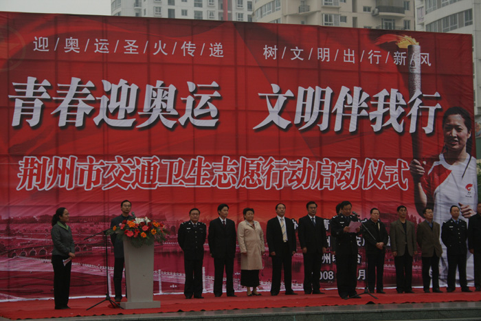 (大学生记者:吴辉)4月13日上午,由共青团荆州市委、荆州市公安局、荆州市电视台联合荆州各大高校共同举办的“青春迎奥运、文明伴我行”大型志愿活动启动仪式在荆州市沙隆达广场隆重举行。